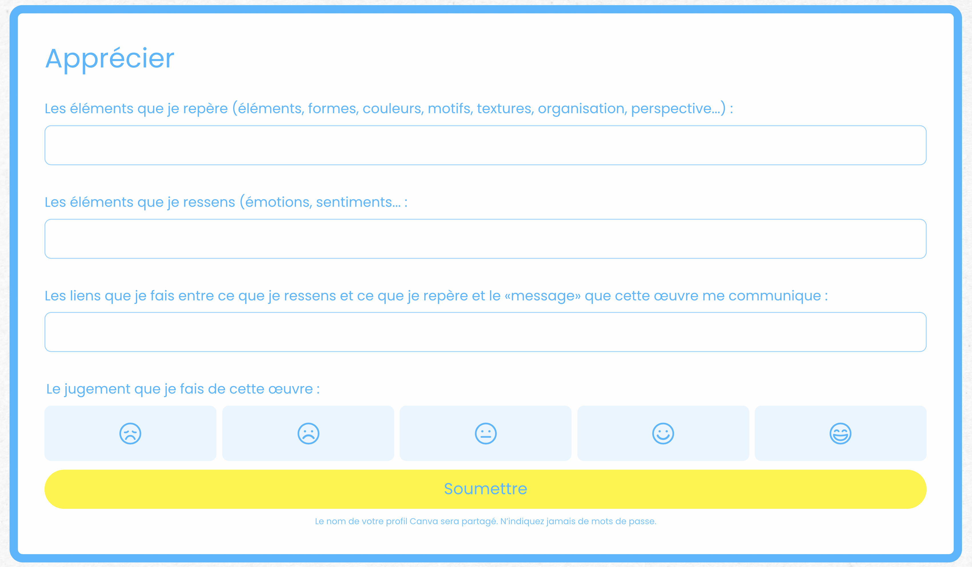 Voici une fiche d’appréciation réalisée dans CANVA qui est modifiable. Vous pouvez la partager avec le lien de consultation public et vous verrez les réponses de tous vos élèves dans votre propre document maître.