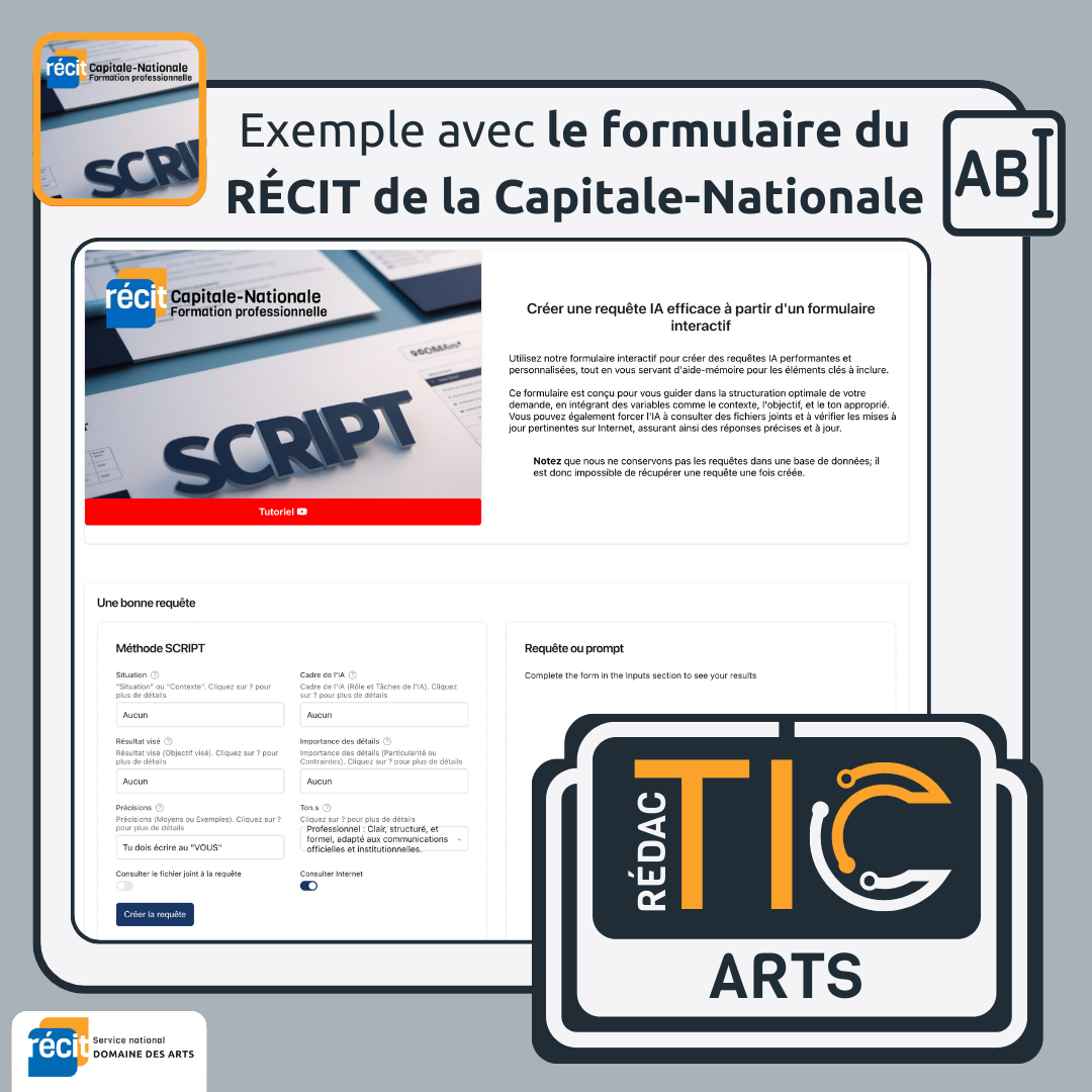 Afin de vous aider dans ce processus et de vous assurer de ne rien oublier, Stéphane Lapointe, conseiller pédagogique RÉCIT de la Capitale-Nationale en formation professionnelle, a mis à notre disposition un formulaire interactif qui nous guide dans la structuration de la requête. On peut clique sur les bulles avec un point d’interrogation pour afficher des informations supplémentaires en lein avec ce qu’on doit écrire dans les différents champs. Le résultat est un paragraphe à copier et ensuite coller dans notre outil d’IA texte préféré.